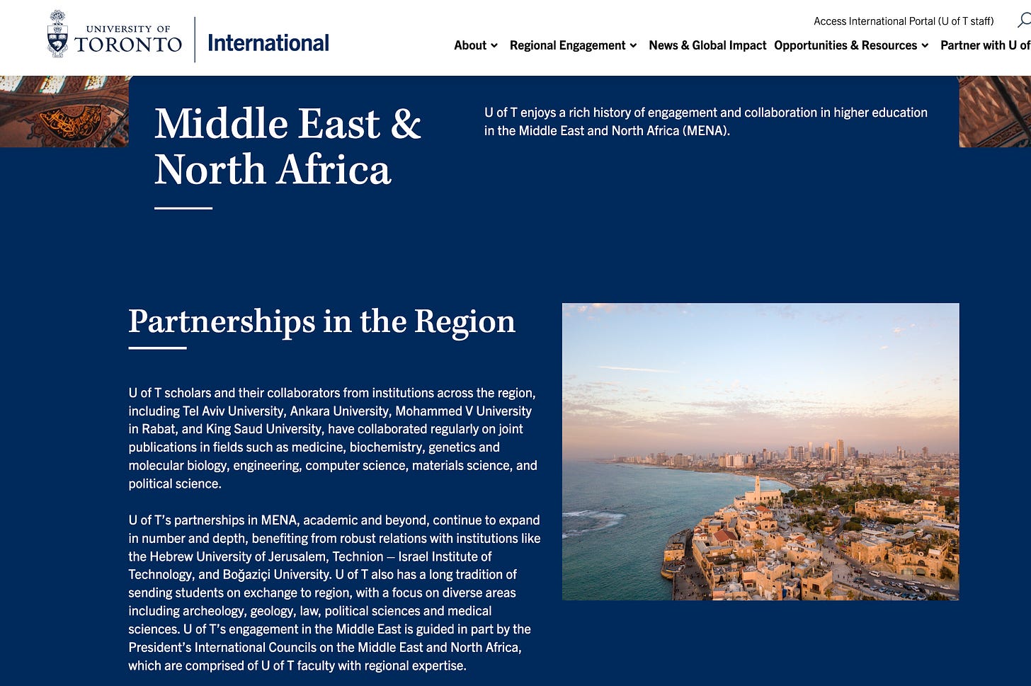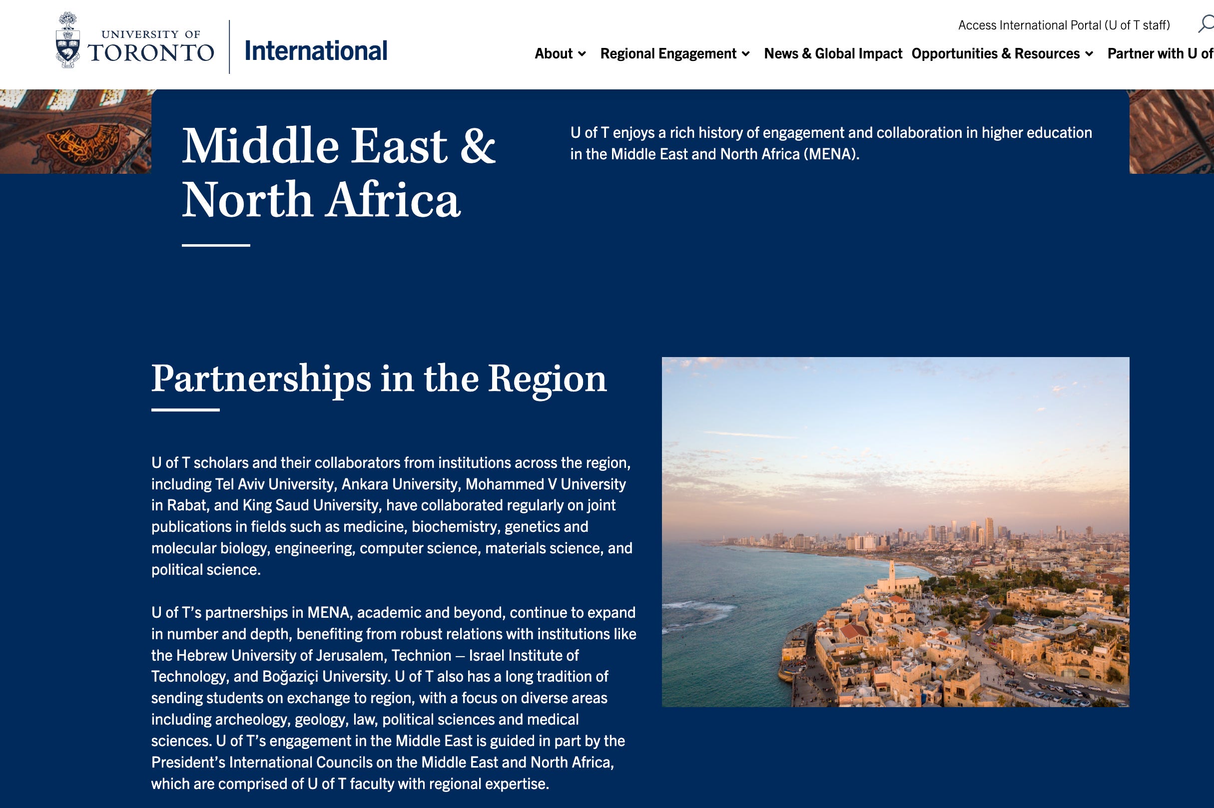 UofT International’s “MENA: Partnerships in the Region” page specifically names three universities, two of which are located in Israel: The Hebrew University of Jerusalem, Technion, and Boğaziçi University in Istanbul. In other words, not only has UofT not developed a single partnership with a Palestinian institution these past 20 years, but it has also failed, as per available information, to do so with any of the world’s 22 Arabic-speaking countries. Why is that? One wonders.