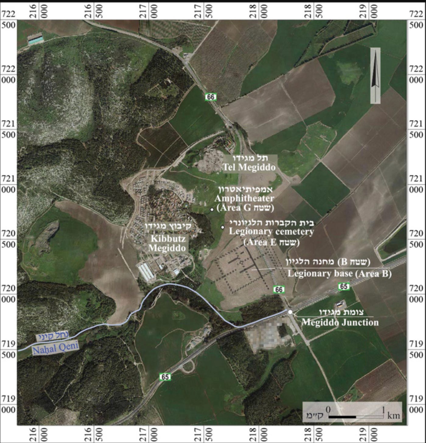 We do, however, find the prison explicitly mapped, and mentioned, in a 2013 report on electromagnetic and archaeophysical investigations conducted at Legio. There, the authors specify that a “large-scale salvage excavation was conducted by [Yotam] Tepper on behalf of the Israel Antiquities Authority (IAA) at the modern Megiddo prison compound on the southern edge of the site of Legio. These excavations suggested that this part of the site be identified as the historical village of Kefar ‘Othnay” [our bold].